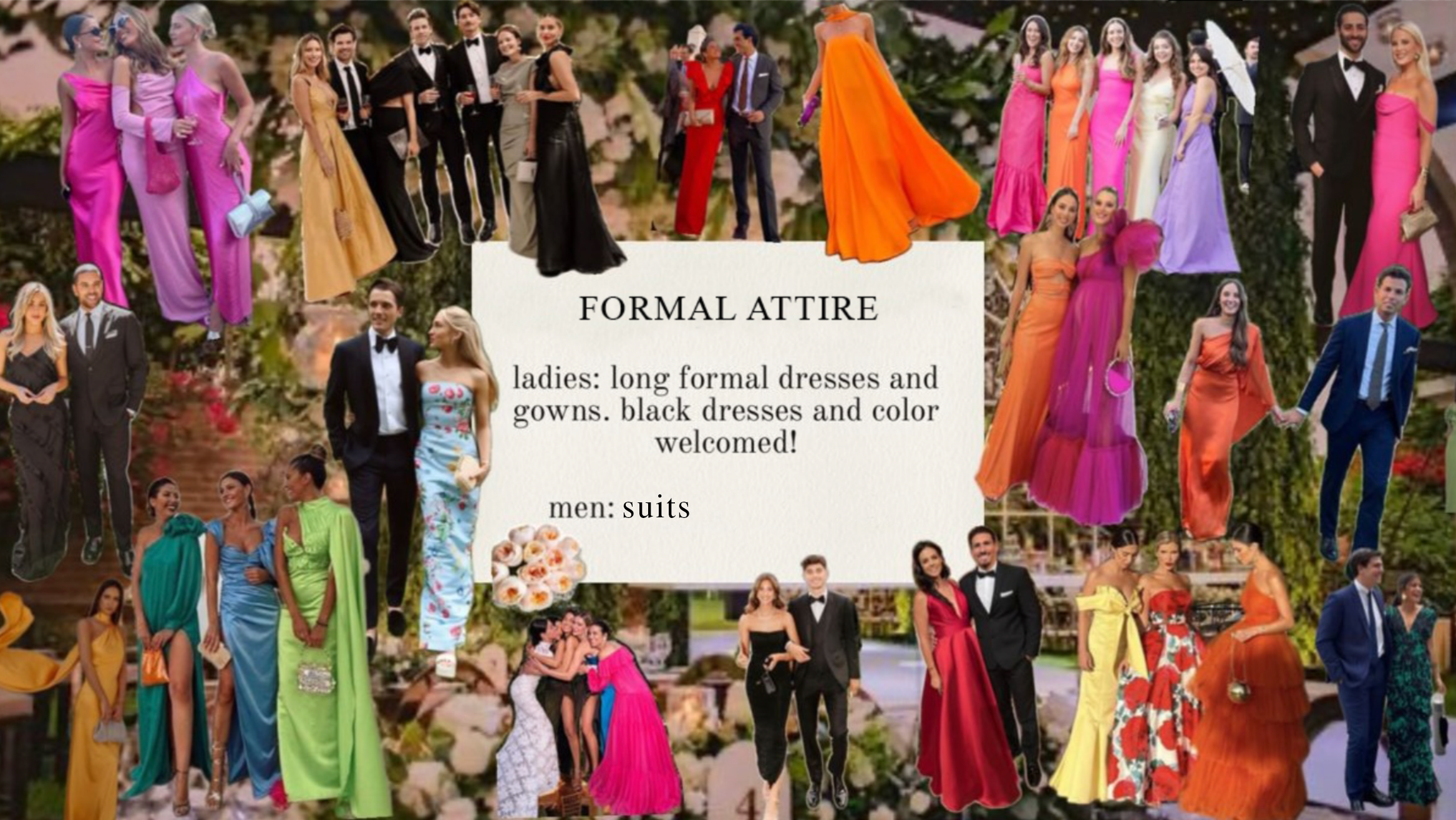 These dress codes and pictures are intended to serve as a guide to help you decide what to wear, so you feel confident, comfortable, and appropriately dressed for each event. The wedding day is a formal affair, so let’s have fun, get dressed to the nines, and celebrate in style!